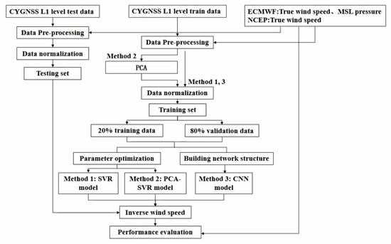 The process of high wind speed inversion in this paper can be briefly summarized into four parts: (i) determining the satellite data as well as wind speed data used; (ii) preprocessing and normalizing data; (iii) training the processed data with the three machine learning methods described above; (iv) using test data to inverse wind speed and analyzing performance of inversion wind speed. The specific wind speed inversion process is shown in Figure 3.
