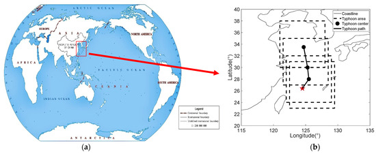 (a) Location of the region for performance evaluation (world map: preview number: GS (2016) 1563); (b) Typhoon Bavi (2020.8.22~2020.8.26) moving track map and daily interested area.