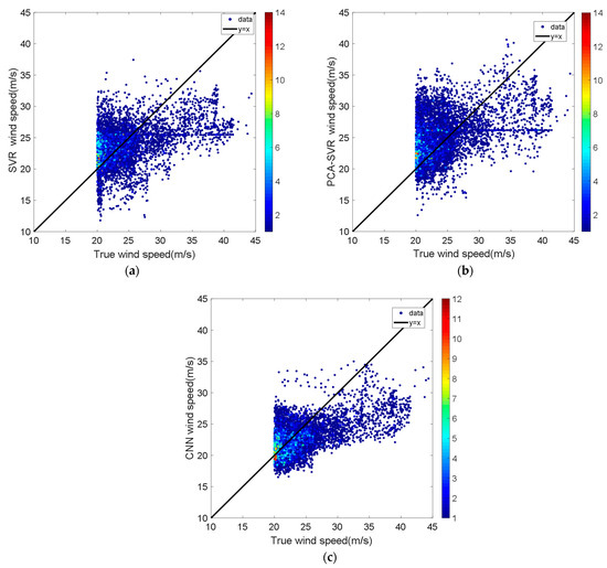 (a) SVR model wind speed inversion results; (b) PCA-SVR model wind speed inversion results; and (c) CNN model wind speed inversion results. The color bar on the right represents data density.