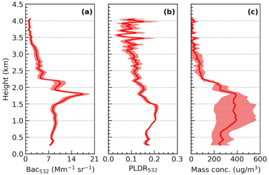 Uncertainties in the retrieve of dust and urban haze mass concentrations mainly include two parts: (a) uncertainty of PRL observations, i.e., PLDR532 and Bac532, it primarily depends on the signal-to-noise ratio of the PRL backscatter signal [41]. The uncertainty of the Bac532 and PLDR532 below 3 km during our measurements is about 2–15% and 2–20%, respectively. (b) The input parameters are listed in Table 1, i.e., the assumption of dust and urban haze PLDR532 threshold. Uncertainties in retrieved mass concentrations are calculated by the law of error propagation. Each input parameter in Table 1 changes within the specified value range (here we set one standard deviation), while other input parameters are set to a fixed value, and the sensitivity of the parameters in Table 1 are tested. Generally, the uncertainty of mass concentrations below 3 km ranges from 15% to 70%.