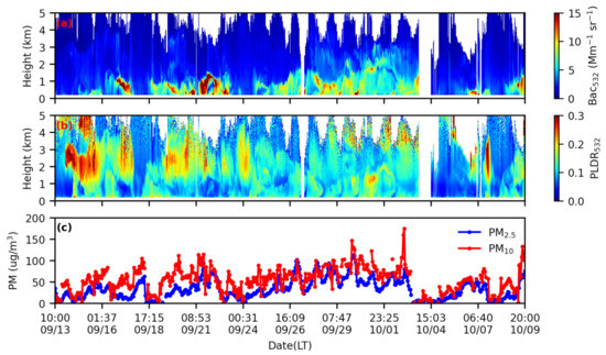 The vertical distribution of Bac532 and PLDR532 during the whole observation period is shown in Figure 2. Four haze episodes were captured according to the high Bac532 (>5 Mm−1 sr−1) in the lower lidar layer, i.e., 15 September to 18 September, 19 September to 23 September, 24 September to 3 October, and 5 October to 8 October. Surface PM10 and PM2.5 mass concentrations also present the same period air pollution cycles. Moreover, there is a significant positive correlation between surface PM10 and PM2.5 mass concentrations (Pearson correlation R = 0.84, p < 0.01), which are typical saw–tooth cycles [42], indicating the haze episodes are usually controlled by meteorological parameters, such as cross-regional transmission of air pollutants.