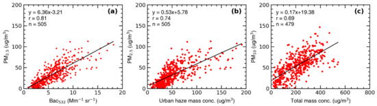 Scatter plots show the correlation between the (a) hourly average Bac532 at 250 m and surface PM2.5, (b) hourly average urban haze mass concentrations at 250 m and surface PM2.5, and (c) hourly average total mass concentrations at 250 m and surface PM10.