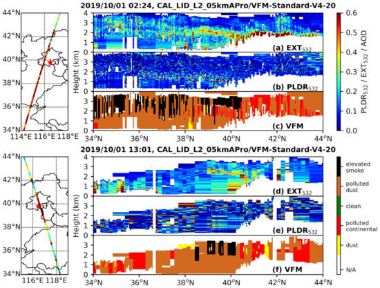 The Cloud-Aerosol Lidar and Infrared Pathfinder Satellite Observations (CALIPSO) lidar was launched in 2006, and it is the first active remote sensing instrument to observe the vertical profile of aerosol and clouds [34,35]. The satellite’s orbit passes over Beijing at about 2:20 and 13:00, two CALIPSO overpasses were found on 1 October 2019. In this study, level 2 aerosol products (“CAL_LID_L2_05kmAPro–Standard–V4–20.”), i.e., extinction coefficient at 532 nm and PLDR532 were used. In addition, CALIOP Level–2 vertical feature mask (VFM) product (“CAL_LID_L2_VFM–Standard–V4–20.”) was also presented to identify the Asian dust layers and urban haze over North China plain.