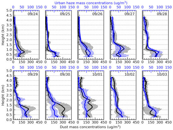 Height profiles of the daily average dust mass concentrations (black) and urban haze mass concentrations (blue). The envelopes in dust and urban haze mass concentrations represent the one standard deviation at each height. The date is displayed at the top right of each panel.