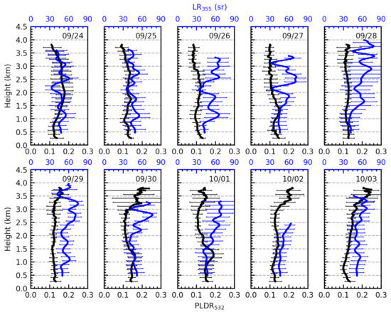 Height profiles of the daily average PLDR532 (black) and night-time average LR355 (blue). The envelopes in PLDR532 represent the one standard deviation at each height, and the envelopes in LR355 indicate the errors at each height. The date is displayed at the top right of each panel.