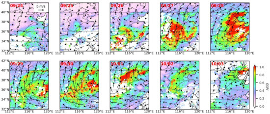Spatial distribution of the daily AOD from 24 September to 3 October 2019 retrieved from the Moderate Resolution Imaging Spectrometer (MODIS). The black arrows overlaid on the map represent the surface wind speed and direction. The date is displayed at the top left of each panel.