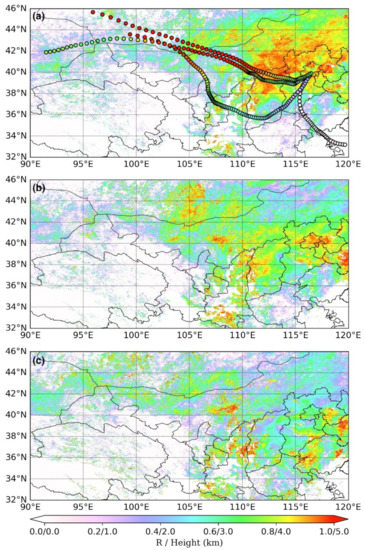 Spatial distribution of the correlation coefficients between observation site and each grid’s daily AOD at lag (a) 0 day, (b) 1 day, and (c) 2 day from 24 September to 3 October, 2019. Seventy-two hour backward trajectories arriving at the observation site at 10:00 LT on 1 October 2019 at 500 m, 1500 m, 2500 m, and 3500 m overlaid on (a).