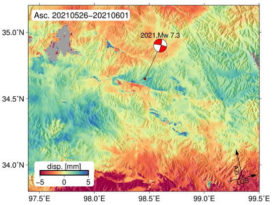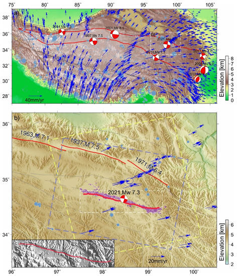 Due to ongoing continental collision of the Eurasian and Indian plates, the Tibetan plateau is one of the regions globally with intense seismicity resulting from significant tectonic loading and crustal deformation. A series of large-scale active strike-slip faults and active sub-blocks are widely distributed across the Tibetan plateau. Among them, the Bayanhar block (Figure 1a), on the northern Tibetan plateau, is demonstrated to be the most seismically active sub-block in recent years. A series of major earthquake sequences occurred at the boundary of the Bayanhar block, including the 1997 Ms7.5 Manyi earthquake, the 2001 Ms8.1 Kokoxili earthquake, the 2008 Ms8.0 Wenchuan earthquake, the 2010 Ms7.1 Yushu earthquake, the 2013 Ms7.0 Lushan earthquake and the 2017 Ms7.0 Jiuzhaigou earthquake (Figure 1a). The seismic hazards of the existing unruptured sections of the main boundary faults, such as eastern part of the Kunlun fault, have been receiving extensive interest [1,2,3]. However, the seismic hazard of several important secondary faults in the interior of the block lacks detailed kinematic investigations and receives little attention due to limited geodetic observations. On 21 May 2021, a moment magnitude (Mw) 7.3 earthquake occurred in Maduo County (Qinghai Province, China). The epicentre was located at (34.59°N, 98.34°E), with a focal depth of 17 km, as determined by the China Seismological Network (http://www.csi.ac.cn/, accessed on 21 May 2021). This event demonstrates the great potential of generating major earthquakes of the subsidiary faults inside the blocks.