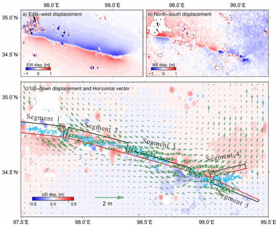 Our derived three-dimensional displacement fields of the Maduo earthquake are illustrated in Figure 3. Our result confirms that the Maduo earthquake is dominated by left-lateral strike-slip motion, suggested by the dominant contributions from horizontal, i.e., east-west (EW) and north-south (NS), displacement components. The amplitude (exceeding ±0.8 m) of the EW displacement is the largest, and the EW displacement field is largely associated with the left-lateral strike-slip shear of the seismogenic fault. The EW displacement field also contributes to the observed large displacement gradient near the fault (Figure 3a). The NS component has a maximum displacement of ~0.8 m in the northern side of the fault and ~0.9 m in the southern side of the fault. The spatial distribution of the NS displacement field is more complex and spatially heterogeneous with some small-scale near-fault features at different fault segments, which are spatially corresponding to the local fault geometry (Figure 3b). The vertical displacement component has the smallest amplitude (<0.5 m), only about half of the horizontal components (Figure 3c). Moreover, the vertical displacement distribution is very uneven.