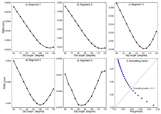 (a–e) Trade-off curve between root-mean-square (RMS) misfit and dip angle for five fault segments in the slip model. The red point indicates the best-fitting dip angle used to invert the coseismic slip distribution shown in Figure 5. (f) Trade-off curve with model roughness plotted as a function of RMS misfit. The red dot is the preferred smoothing factor (0.11) used in our coseismic slip distribution inversion.
