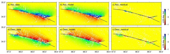 Figure 2a,c show our derived coseismic interferograms on the ascending and descending tracks. Overall, InSAR observations captured the complete and large-scale coseismic deformation field of the Maduo earthquake. The nearly linear and continuous displacement discontinuity only exists in the near-fault area resulting from the low coherence produced by the large displacement gradient across surface ruptures, which informs us the possible trace of surface ruptures. Additionally, InSAR observations, on both ascending and descending tracks, demonstrate a slightly asymmetrical pattern across the fault, indicating a possible fault geometrical variation along the whole rupture. In our displacement field, a positive displacement value indicates surface motion towards the satellite, while a negative value means surface motion away from the satellite. The northern part of the deformation field shows negative displacement in the descending deformation maps (Figure 2b), while positive displacements in the ascending deformation maps (Figure 2d). Such result demonstrates a left-lateral strike-slip motion of the seismogenic fault, which is generally in agreement with focal mechanism solutions (Table 2). InSAR deformation maps clearly show that the whole displacement field covers an area of approximately 200 km × 70 km. The displacement fields on both the ascending and descending tracks indicate a maximum peak-to-trough offset of ~2 m in the LOS direction near the central segment of the fault (Figure 2g,i).