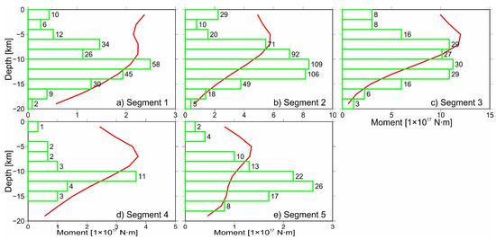 Depth distribution of the accumulative moment (red curve) and number of aftershock for five fault segments.