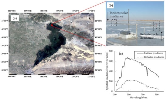 (a) Location of Wuliangsuhai Lake, (b) the Trios spectral irradiance sensors at the observation site on the ice surface, and (c) the incident and reflected spectral irradiance measured at 12:00 on 22 January. The arrows in (b) indicate the incident directions of light to the sensors.