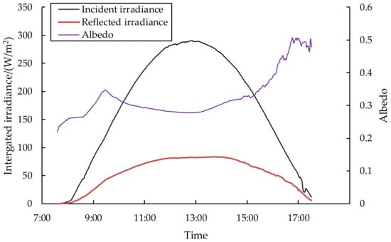 The albedo of ice is among the critical factors that influence the penetration of solar radiation into the lake under the ice in winter. In the calculation of the land surface energy balance and plant growth, the solar radiant flux with a solar altitude less than 15° accounts for about 10% of the total daily flux, and at a solar altitude less than 5°, the portion is only 1%. Therefore, radiant energy is negligible when the solar altitude angle is small. Researchers choose the starting points for analyzing the diurnal variation of albedo using different bases. Several use the solar altitude as a basis, for example, 5° [,], 15° [], 30° [], or even 40° []. Others use the radiant flux as the basis, such as 5 W/m2 [], 30 W/m2 [], 50 W/m2 [], and 100 W/m2 []. In a few studies, there are also prescribed time periods of 8:00–18:00 [] or 6:00–19:00 [] in winter and spring, respectively, when analyzing the measured albedo.