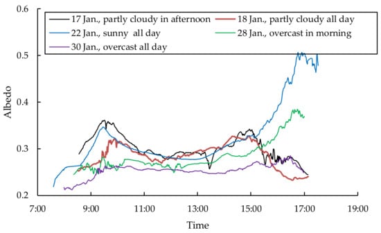 The differences in the albedo during the five different types of weather shown in Figure 3 were mainly due to the influence of cloud cover. The solar radiation is affected by the cloud cover []. At any solar altitude angle, the greater the cloud cover, the lower the solar radiation intensity that reaches the ice surface. It was also found that the influence of the cloud cover on the albedo is not only reflected in the values of the peak albedo, but also in the timing of the peak. In general, the first peak appears later in the morning and the second peak appears earlier in the afternoon, on a cloudy day. However, the albedo data collected on the ice surface of Wuliangsuhai Lake under cloudy conditions are insufficient. Particularly lacking are quantitative data for the cloud cover due to the commonly used method of recording in tenths. The classifications generally used to describe the weather, such as sunny, cloudless, partly cloudy, and overcast, are not suitable for a quantitative analysis of the albedo. Therefore, it is not possible to develop a statistical expression of cloud cover using the Laplace model parameters. Previous studies have also only carried out a quantitative analysis of albedo on sunny and overcast days. An increased accumulation of field measurements on cloud cover using a quantitative method will be necessary in the future.