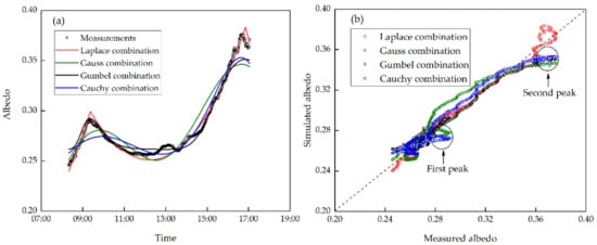 The Gumbel combination was a good fit for the first peak in terms of value and position, but a relatively poor fit for the second peak. The simulated second peak was lower and earlier than the actual measurement. In addition, the trough simulated by the Gumbel combination was flatter around solar noon. The Laplace combination fitted the observed albedo curve best. The simulated peaks had a sharp shape, resembling the measured peaks only with slight overestimates, as there is a sharp peak in the curve of Laplace function itself. The simulated positions of peaks also corresponded accurately. The simulated curve between the two peaks was also close to the actual observations.