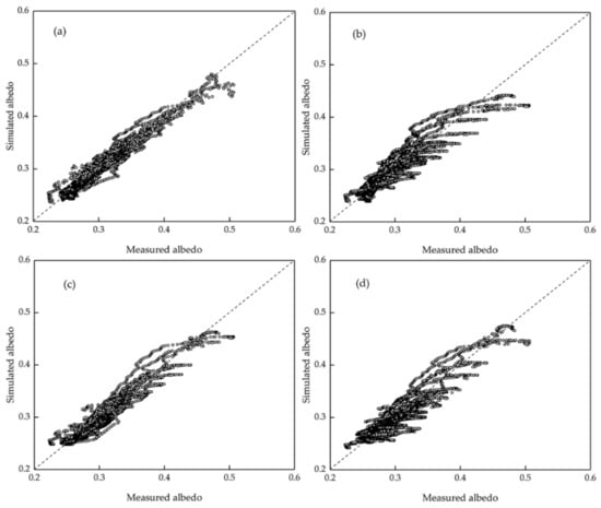 Figure 6 plots the simulated albedo using the Laplace model for the diurnal variations on the 12 sunny days against the observed data. The correlation coefficients and errors between the simulated and measured data of each day were calculated (Table 6). The correlation coefficients are all at a high level, and the maximum root mean square errors of the 12 days are less than 0.016. The overall simulation coefficients of the model derived from the albedo for each day are also listed in Table 6.