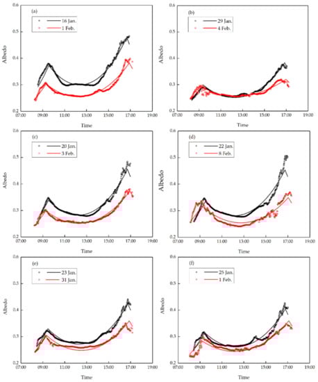 Simulation curves of the albedo derived from the Laplace combination for 12 sunny days with a solar altitude angle of ≥5°: (a) 16 January and 1 February, (b) 29 January and 4 February, (c) 20 January and 3 February, (d) 22 January and 8 February, (e) 23 January and 31 January, (f) 25 January and 1 February The circles and lines are measured data and fitted curves, respectively.