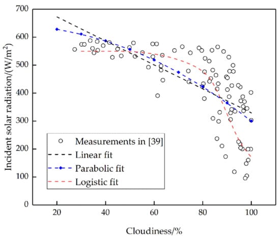 It has been reported that solar radiation decreases linearly with increased cloudiness in the semi-arid region in Western China (Figure 7) []. The previously reported relationship is given by Equation (14). However, the trend in the variation of incident solar radiation with respect to cloudiness shown in Figure 7 is actually non-linear, and the linear fit is not appropriate.