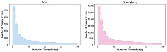 The distributions of the parking durations in two different areas (Mint and Queensberry) in Melbourne in July 2017.