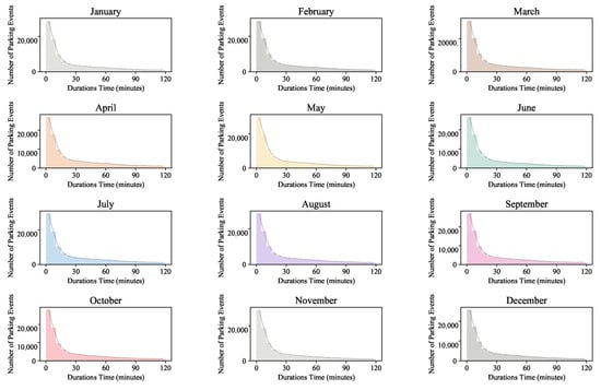 The distributions of the parking durations in the Queensberry area in Melbourne in each month of 2017.