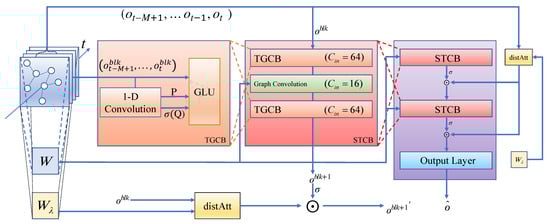 To combine the temporal POR data and spatial-featured graph, as shown in Figure 3 (left), we construct the Spatial–Temporal Convolutional Block (STCB) , which consists of two TGCBs and a graph convolutional block in the middle. The TGCB and the graph convolutional block are used to extract temporal correlations and spatial correlations, respectively. Let be the input of all the historical observations used for prediction; the output , which passes by one STCB , is computed as