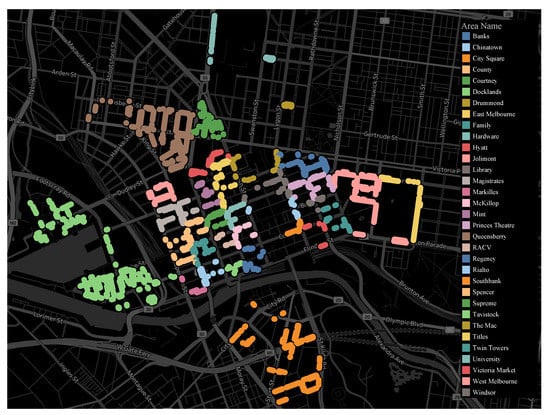 In this section, we conduct experiments to evaluate the proposed parking occupancy prediction scheme by using real-world datasets. The two datasets used in this paper are from the open data platform of Melbourne [6,37]. One dataset (dataset I) is a map indicating the positions of all 4657 parking bays and 33 areas in the city of Melbourne, as shown in Figure 4. The other dataset (dataset II) records all of the parking events of every parking bay in the city of Melbourne in 2017. In dataset II, the parking data were already influenced by many factors, such as schools, hospitals, weather, and residential areas. In other words, the parking data were influenced by the activities of all people in Melbourne. It is difficult to consider a single factor while keeping other factors constant. In addition, parking events are affected by these factors jointly. Modeling the parking events in several areas and using the datasets generated by simulations may verify the effects of a single factor on the experimental results, but they do not represent the true situation. Therefore, we considered these factors as an indivisible whole. The main features of dataset II are shown in Table 1.