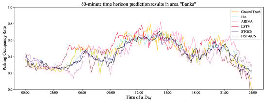 To better illustrate the performance of the benchmark models and the proposed model, we also randomly selected one area (e.g., “Banks”) and used the real observation data (i.e., the ground truth) of this area for a comparison. The comparison results are shown in Figure 7, Figure 8 and Figure 9. Obviously, there were time lags in the ARIMA model. For the STGCN and LSTM models, the prediction results fluctuated greatly over time. In addition, it can be seen from these figures that the prediction results of the three models above were also greatly affected by the lengths of the prediction horizons. The shorter the time horizon was, the better the prediction results were. For the proposed HST-GCN model, the figures show that the prediction results were approximately consistent with the real values.