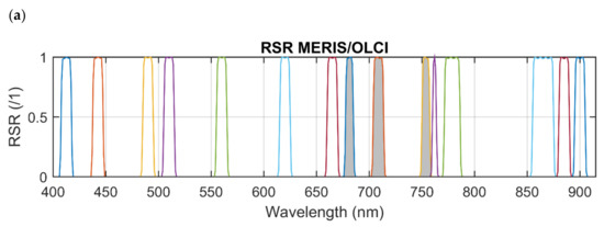 MODIS-Aqua (hereafter simply MODIS), MERIS, and OLCI, provide multispectral images for the periods 2002–present, 2002–2012, and 2016–present, respectively. The three sensors have a revisit frequency of ~1–3 days, which adequately captures the temporal variability of algal blooms and is suitable for continuous time-series analyses. Their relative spectral responses (RSR) are shown in Figure 1; a critical difference is that MODIS lacks a band near 708 nm which is the key band used for line-height algorithms such as the MCI. While MERIS and OLCI have a spatial resolution of 300 m, MODIS bands consist of both “Land” bands at 250–500 m and “Ocean” bands at 1 km spatial resolution. These “Land” bands are designed to measure reflectance over land, clouds, and ice and so have a much larger radiometric range than the “Ocean” bands, which are designed to be more sensitive to optically darker aquatic signals [32]. The MODIS L2 products contain these higher resolution bands aggregated to 1 km resolution to correspond with the ocean bands.