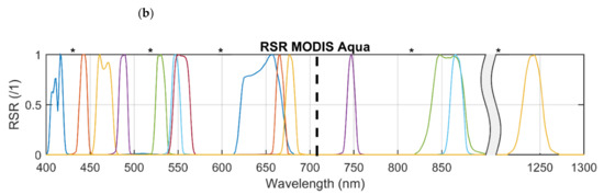 The relative spectral responses (RSR) for (a) MERIS/OLCI and (b) MODIS Aqua. Shaded bands in (a) are those bands required for the MCI. Dash line in (b) is the location of the MERIS/OLCI 708 nm band for reference. * denotes the higher spatial resolution “Land” bands.