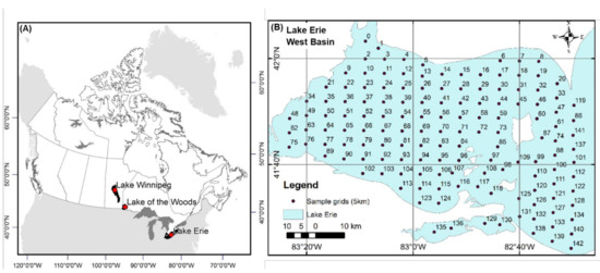 (A) Location of the primary lakes of interest, and (B) the grid points used to collect training data for the NN from the Western basin of Lake Erie.