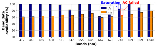 The percentage of valid spectral data for MODIS L2 Rrs and ρs from the WLE grid data.