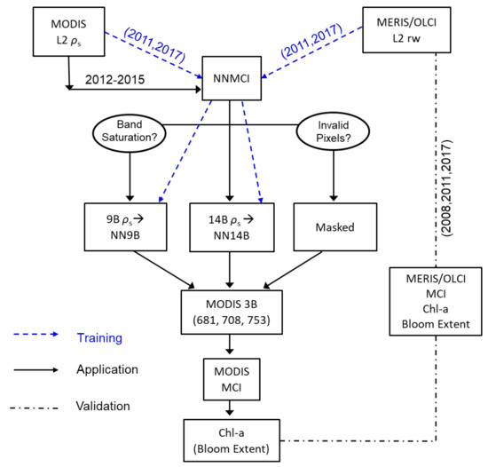 The overarching goal of the NN was to use years where both MODIS and either MERIS or OLCI data was available as training input data, in order to output the MERIS or OLCI equivalent MCI bands from MODIS and a consistent MODIS MCI-derived bloom spatial extent product. MODIS spectral ρs and coincident MERIS and OLCI rw, for the years 2011 and 2017, respectively, were used to train the NN. When MODIS ρs was valid across all wavebands, the 14 bands centered from 412 nm to 1240 nm were used as the NN input. Due to sensor saturation in high biomass conditions, however, many spectra lacked valid ρs for certain bands especially in the R-NIR range (e.g., 667 nm and 678 nm). In an effort to overcome the impact of band saturation to provide bloom detection over those bright water targets, the nine bands (including five ‘land’ bands) with the lowest probability of saturation were used as NN input instead. The NN model with 14 bands as input is denoted as NN14B, while that using nine bands is denoted as NN9B. For rare cases (<5%) where less than nine bands remained unsaturated, the pixel was not trained/processed. These processing components together make a NN model denoted as NNMCI. Following independent training of NN14B and NN9B, the NNMCI was then applied to MODIS ρs imagery for years when MERIS/OLCI observations are absent, to simulate the 3 MCI bands, calculate the MCI-derived Chl-a, and report on algal bloom spatial extent according to the aforementioned steps.