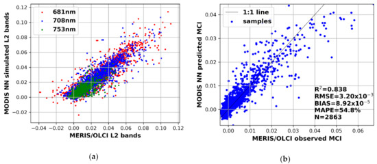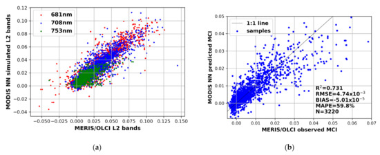 The NN14B performance to predict (a) MODIS bands at 681, 708 and 753 nm, and (b) resulting MCI. The band reflectance and MCI are dimensionless.