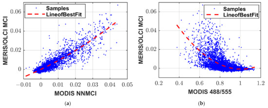 As shown in Figure 6, the MODIS CI is different from the CI originally defined for MERIS [35], measuring the depth of the reflectance trough at 678 nm relative to a linear baseline between 667 nm and 748 nm. Under intense bloom conditions, the CI and MCI have been previously shown to be in good qualitative agreement on Lake Erie [2], however, this analysis highlights some differences in the anticipated retrieval consistency. Mathematically, the MODIS CI is the same as the MODIS Fluorescence Line Height (FLH), which in low trophic conditions is positively correlated with chlorophyll due to the fluorescence peak at 678 nm. In eutrophic conditions, and under cyanobacteria dominance where fluorescence yield is lower [57], the index is driven more by chlorophyll absorption, and therefore the relationship is reversed. This is in agreement with the findings of Gons, et al. [58], who documented the effective use of the MERIS FLH product in oligotrophic waters of the Laurentian Great Lakes, but with FLH diminishing and becoming negative in mesotrophic and eutrophic waters. Figure 9d, therefore, captures that bimodal relationship with MCI, and so while there may be good agreement between the two indices under intense bloom conditions, there is significant divergence at lower biomass. Figure 9 shows that none of these alternate algorithms deliver a superior agreement with the MERIS/OLIC MCI compared with the MODIS NNMCI. Results suggest that adopting alternate algorithm solutions utilizing only those bands available on MODIS to retrieve chlorophyll and in turn bloom extent during the observation gap between MERIS and OLCI will likely introduce greater uncertainty than implementing the proposed NNMCI approach to simulate the MODIS bands required for consistent MCI retrievals.