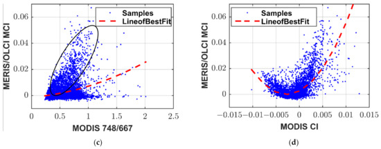 The relationship between MERIS/OLCI MCI and coincident (a) MODIS NNMCI (b) MODIS 488/555, (c) MODIS 748/667, and (d) MODIS CI.
