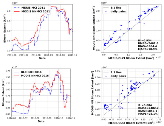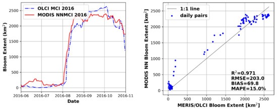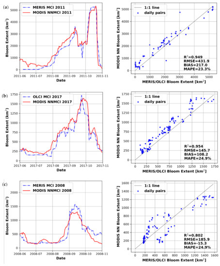 The bloom extent reported from MODIS NNMCI is generally consistent with that of MERIS/OLCI in Figure 10, especially considering the spatial resolution and saturated pixel differences between the sensors. Despite the significant impact of sensor saturation during intense blooms captured in daily scenes (Figure 8), the impact on 14-day rolling average products will be limited to only those pixels persistently saturated over the composite period. Bloom extent in 2011 and 2017 agree very well, tracking the seasonal progression of the bloom and capturing the peak bloom extent of ~5000 km2 and ~1500 km2, respectively. Deriving bloom extent for 2008 the NNMCI performs well despite the absence of this year in the training dataset. Results suggest that bloom spatial extent derived from MODIS can be reliably predicted within <25% of the reference extent captured by MERIS and/or OLCI.