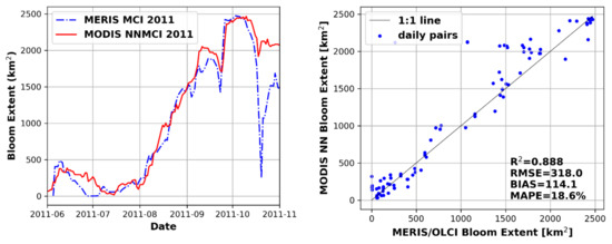 The LoW model resulted in somewhat higher uncertainty (R2 = 0.663, RMSE = 0.0042 for NN14B and R2 = 0.638, RMSE = 0.0043 for NN9B) which is not surprising given the challenges in resolving this complex lake brought about by the coarse 1 km resolution and image distortions due to off-nadir sensor viewing geometry. Despite less than optimal spatial resolution the NNMCI was able to correctly classify bloom presence/absence on LoW 86.8% of the time. Figure 13 captures the satisfactory retrieval of the seasonal progression of blooms on LoW, with MODIS-derived bloom extent within <20% uncertainty compared with MERIS and OLCI. In 2011, MERIS suggests a dramatic drop-off in bloom extent towards the end of October, which in fact is due to an extended period with no valid imagery (10–21 October). In contrast, the higher revisit frequency of MODIS captured a cloud-free image on 15 October with a significant bloom extent. Therefore over this particular time interval, it is the MODIS time-series that is the more reliable.