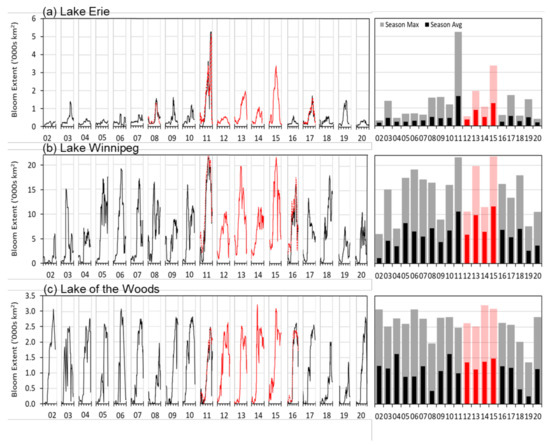 Multi-mission time-series of algal bloom spatial extent for (a) Lake Erie, (b) Lake Winnipeg, and (c) Lake of the Woods, combining MERIS and OLCI (black/grey) and MODIS (red/pink) retrievals.