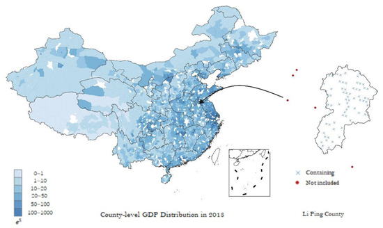 The GDP distribution map of the Chinese Mainland in 2018 (some values along with the boundaries of county-level units are missing), and an example of matching center coordinates and county boundaries. Blue crosses denote center coordinates that fall into the boundary of Liping County, while red points denote centers that do not.