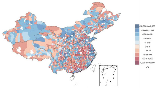 The prediction error map of county-level GDP in 2018. White areas in the map represent regions where data are missing. Due to the large area of the Chinese Mainland, there are a few regions where images are either missing or of poor quality (Hainan Island, for instance). Nevertheless, the number of counties covered by the images we gained is enough for this study.