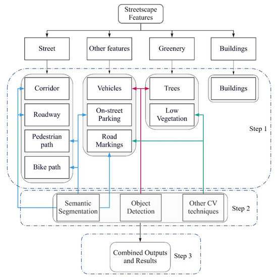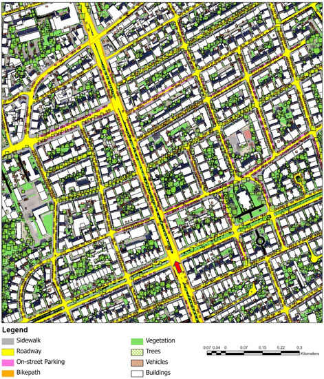 In recent years, research in autonomous vehicles has led to the development of a variety of algorithms that are efficient in classifying streetscape features (Figure 1), although from the street-level perspective. The datasets such as Cityscapes [26], Synthia [27], and KITTI [28], etc., collected with onboard sensors such as LiDAR scanner and multiple RGB cameras, have been since utilized in the training and evaluation of DL algorithms. Such datasets and models are widely available in the open research domain and have generalized well enough to detect and classify common streetscape elements from street view imagery.