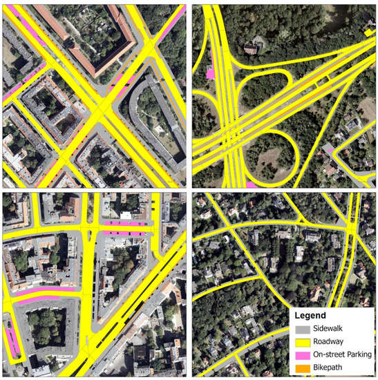 Apart from the VHR data for the study area, this study further utilizes multiple sources to collect training data and pretrained models (Table 1). One of such vital sources is Geoportal Berlin FIS-broker [45], which provides geospatial datasets for the city of Berlin, including VHR satellite imagery. The dataset was created in 2014 and updated in 2019, paired with accompanied VHR satellite imagery at 0.2 m/pixel resolution captured in February 2021. This study utilizes a “Straßenbefahrung 2014” dataset from FIS-broker, consisting of detailed mapping of street-level characteristics. The data is available in WMS (Web Map Services) and WFS (Web Feature Services), which can be downloaded in raster or vector format, respectively. Some of the features included in the dataset are fountains, parking ticket machines, guardrails, hydrants, curbs, display boards, among other standard features such as roadways, bike paths, sidewalks, etc. While most minor features are not discernible through the imagery provided, the inference on major street-level features can be easily made. Five major street-based classes such as corridor, roadway, bike lanes, sidewalk, and on-street parking are utilized from the dataset and separately trained using semantic segmentation models.