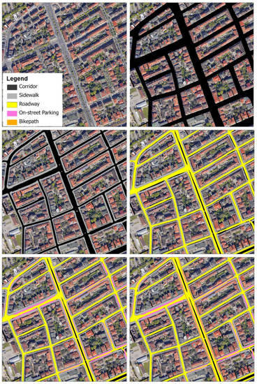 For this study, the roadway is defined as a path utilized only by vehicles (Figure 4). These are the dedicated lanes for use only by vehicles, while sidewalk and bike paths are used only by person on foot or bike, respectively. On-street parking, parallel or adjacent to the roadway, is common in many streets in Germany; hence it is an essential component of the streetscape. The on-street green spaces are widely present in the medians and show significance in the streetscape along the sidewalk. The discussion on delineating green spaces is discussed in the following subsections. The movement corridor is defined as a whole space encompassing all the above characteristics, usually covering the entire space between buildings located opposite the street. In other words, the corridor covers all the areas available for movement through any mode. However, the corridor concept does not apply in this study if the streets do not have a designated roadway. The FIS-broker does not have a “Corridor” as a separate class; hence the other street features are merged together to create one.