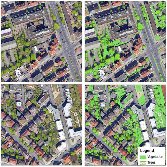 The tree detection utilizes a pretrained DeepForest model. The model is trained on the widely used object detector RetinaNet [64]. The model employs Feature Pyramid Network, which specializes in detecting objects at different scales, and uses the Focal loss function, which removes the class imbalance between foreground and background. The model is sensitive to the size of the image tile provided for the predictions. As the model was trained with 0.1 m/px resolution imagery and 400 px × 400 px dimensions of the tile, the evaluation for our use case is done at 800 px × 800 px, since the study area has a resolution of 0.2 m/px. The pretrained model shows rather average performance in the study area with mAPs of 0.774. The main reason for the performance is the dataset on which the DeepForest model is trained. DeepForest utilizes labeled instances of trees located in forests and non-urban areas. Therefore, the dataset does not include the samples of trees in urban or built environments. As a result, the model misclassifies specific geometries in an urban environment, such as gabled roofs and hedges for trees. Further, the model has been trained on higher resolution image data, which affects tree detection.