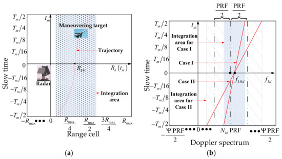 The target motions influence the long-time coherent integration from two aspects, e.g., the envelop and Doppler spectrum. In Equation (7), the envelop offset is . When the envelop offset exceeds the range resolution , the RCM happens [see Figure 1a]. The Doppler spread is in Equation (7). When the Doppler spread exceeds the Doppler resolution , the DFM happens (see Figure 1b). The RCM and DFM degrade the long-time coherent integration. In Figure 1a,b, is the maximum value of , and and correspond to the searching number and maximum searching range of the ambiguity integer, respectively.
