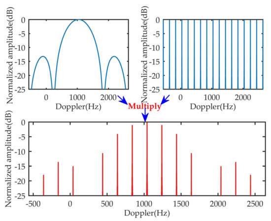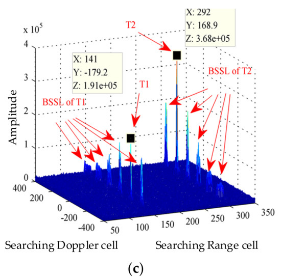 In the bottom figure of Figure 2, besides the peak at , many high sidelobes appear and are right located around ambiguity integer times. They are known as BSSLs which are samples of the first sinc function via the second sinc function marked in Equation (14). Obviously, BSSLs may influence the target detection and localization when we use the constant false alarm rate (CFAR) technique. As we know, the peak-to-first sidelobe ratio along the range dimension is about 13 dB and the influence of the sidelobe can be ignored. Therefore, we refer to this phenomenon and set radar parameters to let the ratio between the peak and BSSLs higher than 13 dB. The width of a sinc function at −13 dB is about twice the resolution. In addition, the interval between two adjacent samples of the first sinc function is . Therefore, if the following Equation (15) holds, the influence of BSSLs may be ignored via a CFAR method.
