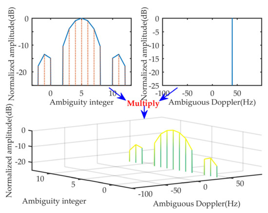 The signal energy after the KTD method is coherently integrated at . Two parameter dimensions, i.e., and , appear in the KTD method instead of one parameter dimension, i.e., , in the MLE method. Comparing Equation (19) with Equation (14), we find that the signal energy distribution along can be seen as extractions of the dimension at ambiguity integers and the signal energy distribution along can be seen as extractions of the dimension in . Here, we use a numerical example to illustrate and dimensions of Equation (19).