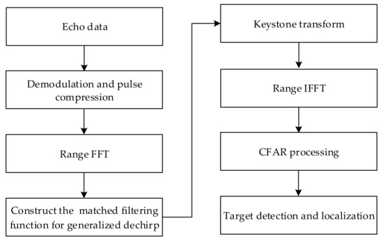The coherent methods use the phase information to guarantee a higher SNR improvement without the “SNR threshold”. The maximum likelihood estimation (MLE) method is a typical coherent method [16]. Afterwards, proposed generalized Radon-Fourier transform [17], Radon-fractional Fourier transform [18], and polynomial Radon-polynomial Fourier transform [19] can be seen as its successful extensions. This kind of processing method is statistically optimal, while it is normally computationally expensive [17,18,19]. The keystone transform (KT) can speed up the MLE method and its extensions [20,21,22,23,24,25]. Unfortunately, under many conditions, the KT may encounter the half-blind-velocity effect and Doppler spectrum coupling [26,27] which may induce the energy spread. So far, to the best of the author’s knowledge, there is no effective method to solve these two problems without any approximation or prior knowledge [26,27]. In order to blindly compensate the nonlinear RCM, high-order KTs are also developed [25,28,29]. Given the problems of the aforementioned coherent methods, researchers have carried out many other kinds of work. Representations include the hybrid integration [30], product scaled periodic Lv’s distribution [31], adjacent cross-correlation function-based method [32,33], and scaled inverse Fourier transform-based method [34,35]. These methods are computationally efficient and do not have problems with the KT-based methods, while they have the integration gain loss.