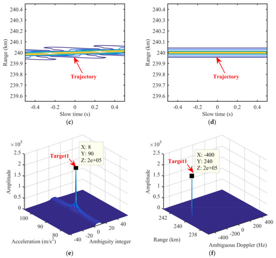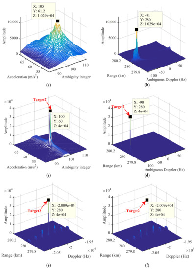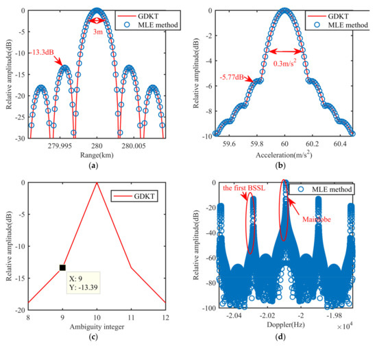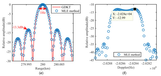 With radar parameters and Equation (33), we could obtain that, for the MLE method and GDKT, theoretical resolutions along the range, ambiguous Doppler (or ) and acceleration should be 3 m, 1 Hz, and 0.3 m/s2, respectively. Simulated resolutions in Figure 8 conform to theoretical resolutions. Simulated PSLs along the acceleration dimension is lower than the theoretical PSL given in Equation (34). This is because corresponding integration variables are different from those in the integrant and the sidelobe is elevated under the finite discrete signal [38,39]. The signal energy distribution along can be seen as extractions of the dimension at ambiguity integers. When the extraction is just not the peak of the first BSSL, the influence of the BSSLs can be reduced. Figure 8f shows zoom part of the first BSSL marked in Figure 8d. Comparing Figure 8f to Figure 8c, we find that the extractions in the GDKT is not the peak of the first BSSL and the influence of the BSSLs is obviously reduced, which indicates that the GDKT benefits the PSL.